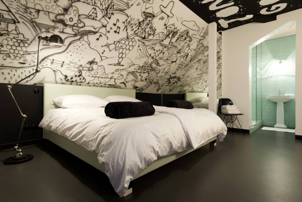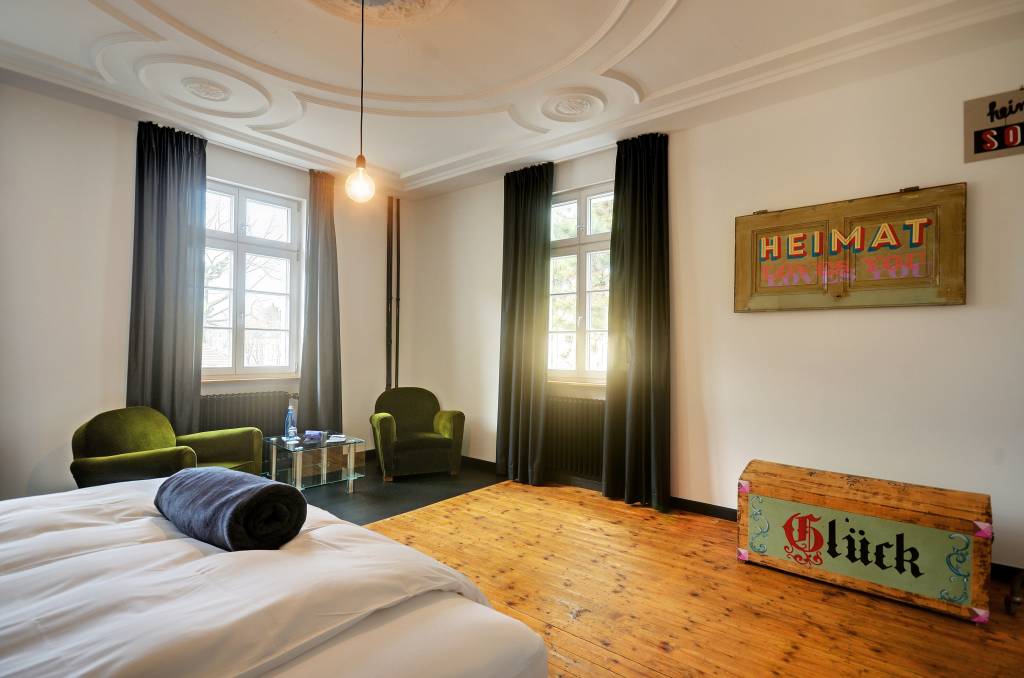 Eine Treppe höher befindet sich unser Boutique-Hotel. Jedes Zimmer ist individuell von Künstlern gestaltet – unter anderem von Stefan Marx, Stefan Strumbel, Blek le Rat, Oliver Rath und Herr von Eden. Das Konzept: gutes Bett, gutes Bad, unkompliziert – dafür voller Atmosphäre.